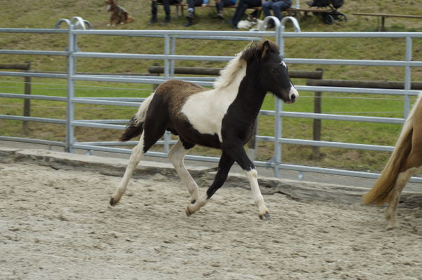 Gut aufgerichtetes, langliniges Fünfgangfohlen mit gutem Fundament, schnellem Tölt, Rennpassansätzen bei guten Bewegungen und schöner Gangverteilung.