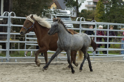 Ausdrucksvolles, lauffreudiges Stutfohlen mit geschmeidigen, taktsicheren Grundgangarten und deutlichen Töltansätzen, zur Zeit stark überbaut.