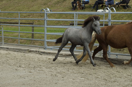 Zierliches, aber weitgehend harmonisch gebautes Stutfohlen mit guter Tempofähigkeit und mittlerer eher weiter Bewegung in Trab und Tölt, zeigte viel Lauffreude und feine Reaktionen.